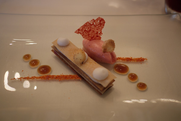 りんご、カシス、ルバーブのミルフィーユ いちごのシャーベット添え